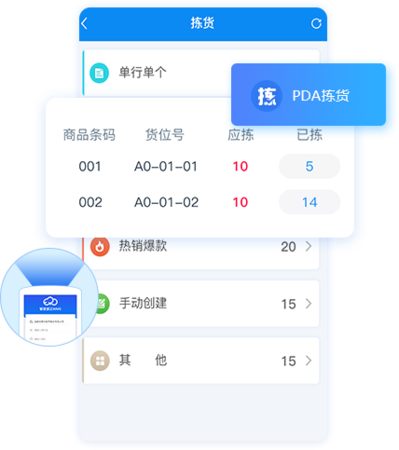 PDA高效拣货;移动验货,称重,发货高效出库;有效管理货位库存;上手快,提高仓库人效